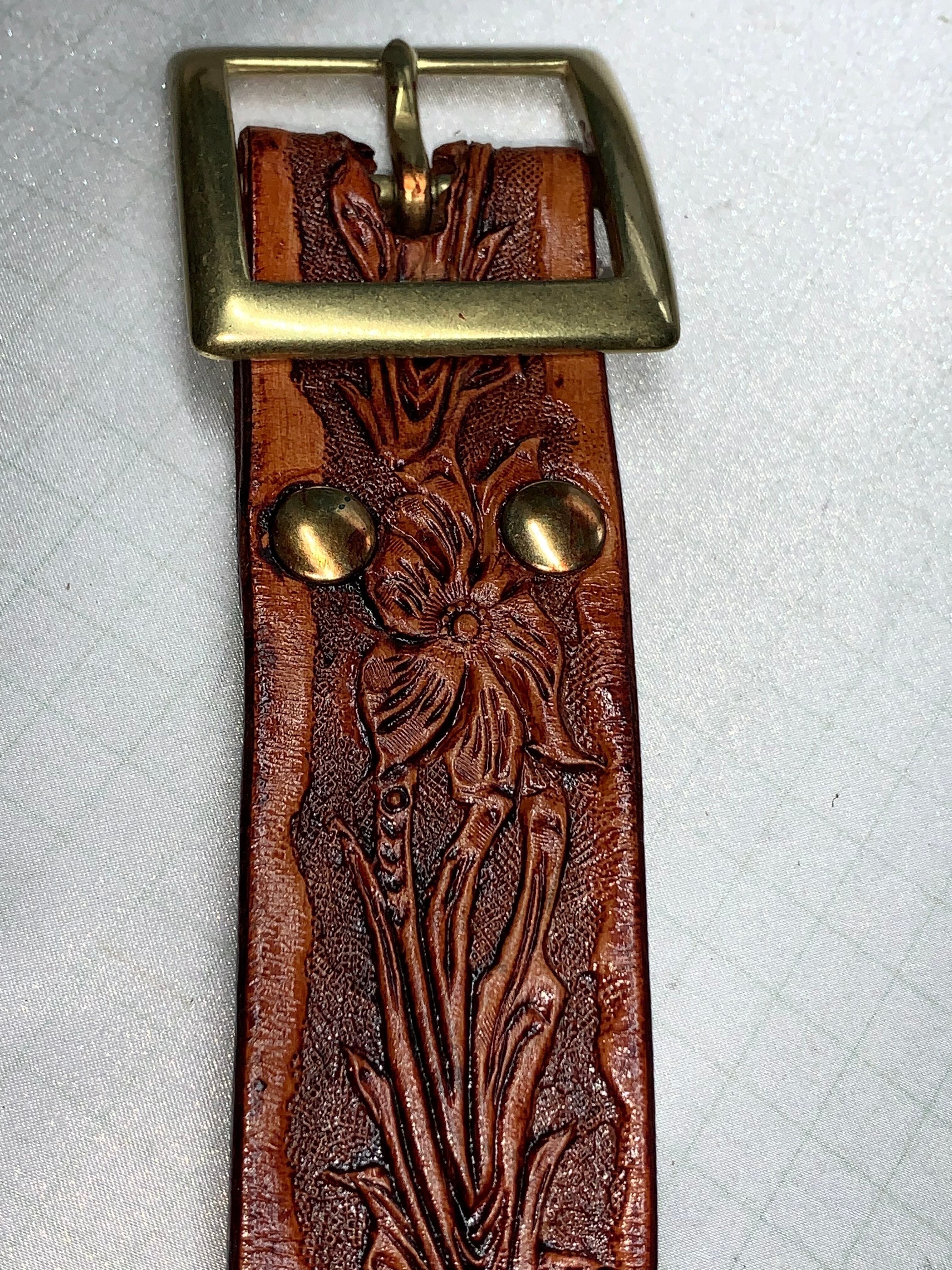 ベルト穴は15穴 (60〜100)㎝ アンティークブラウンで染めました。 花柄立体感は圧巻です。